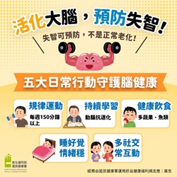 失智症預防宣導海報 預防失智症,要多動腦,並且均衡飲食,常常與家人互動,遠離憂鬱。 守護失智症家人要做到以下4點: <看>發現異狀 <問>關心需求 <留>適當協助 <撥>協助撥打110 #關懷失智_你我做起
