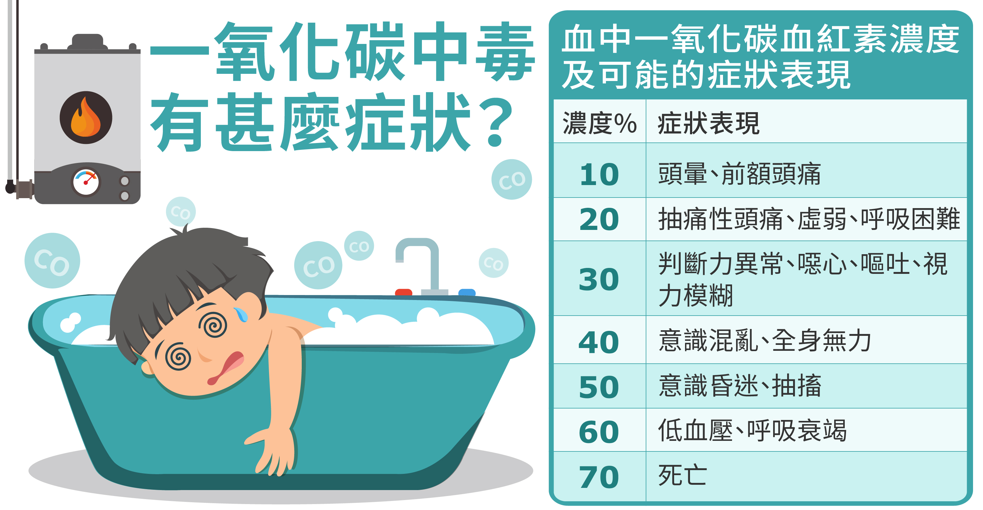 如有出現以下症狀(詳如海報),那就有可能是一氧化碳中毒